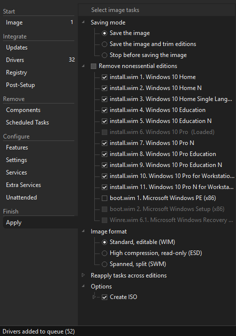 Applyin the left pane. Here you’ll want to configure the options as seen here: Save the image, remove all other editions from install.wim, WIM image format, and Create ISO (you can choose any name you want for it). 🖼️ - Click on